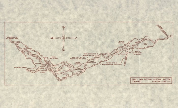 Later, when Spanish settlers arrived in the 1700s, missions and irrigation systems were established in the region. The area west of the river remained more rural, connected to ranching lands and open landscapes outside the early settlement of San Antonio.